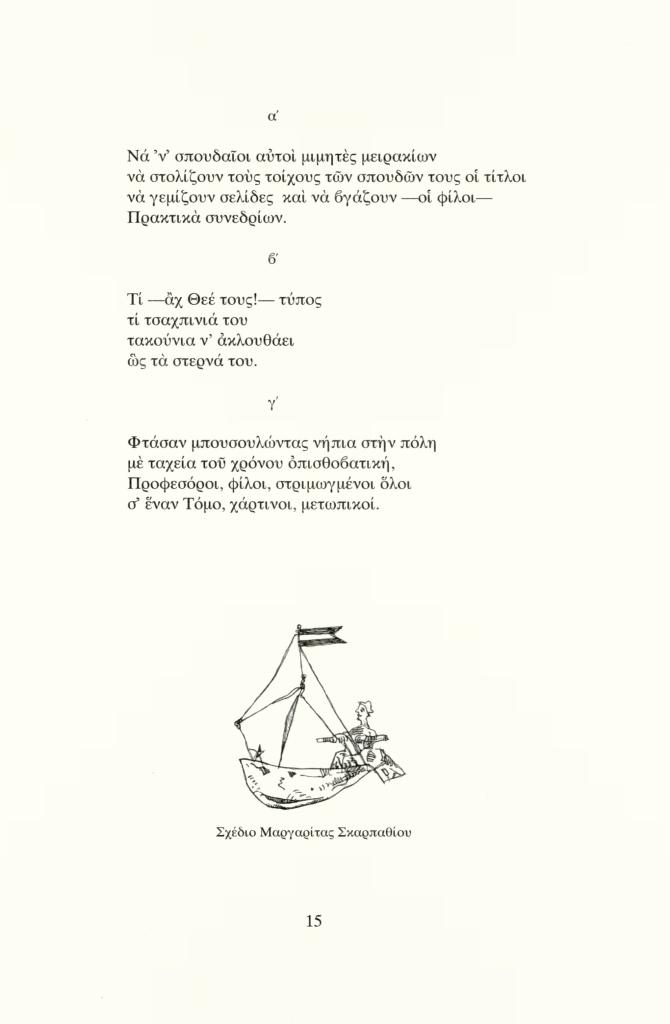 , «Τέσσερα τετράστιχα και τρεις παραλλαγές για τον τόμο των Πρακτικών Συνεδρίου Σκαρίμπα. γ΄ [Φτάσαν μπουσουλώντας νήπια στην πόλη ]», Τα Νεφούρια, τχ. 26 (Πρωτοχρονιά 2011), σ. 15