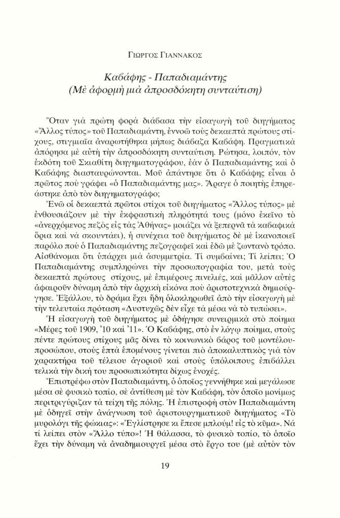 , «Καβάφης-Παπαδιαμάντης (Με αφορμή μια απροσδόκητη συνταύτιση)»,