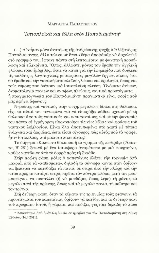 , «Ιστιοπλοϊκά και άλλα στον Παπαδιαμάντη [Απόσπασμα]»,