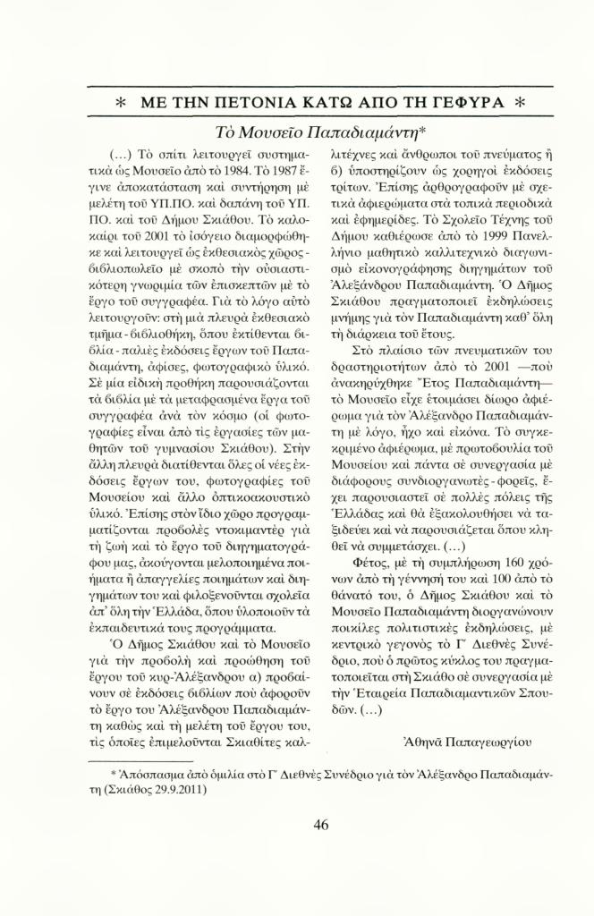 , «Με την πετονιά κάτω από τη γέφυρα. Το Μουσείο Παπαδιαμάντη»,