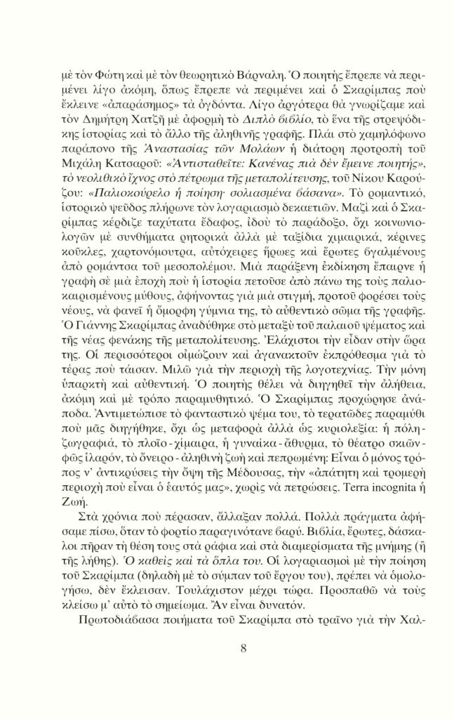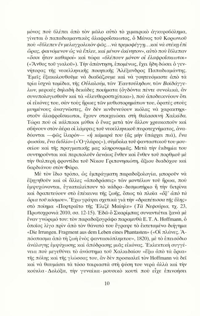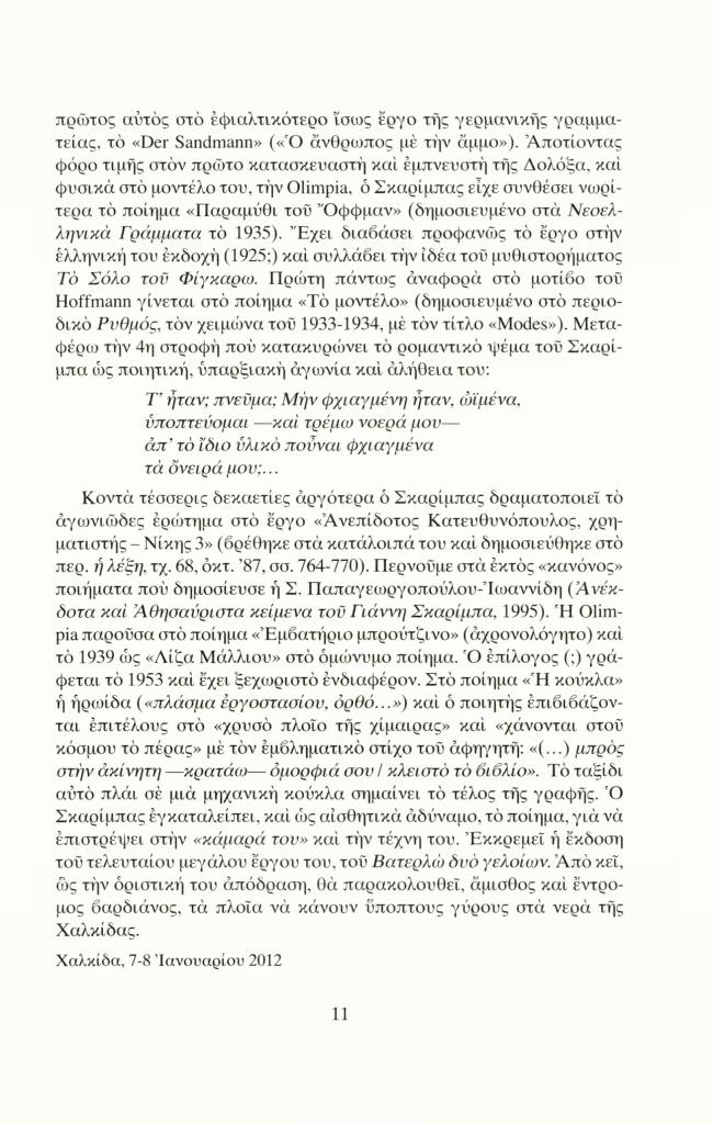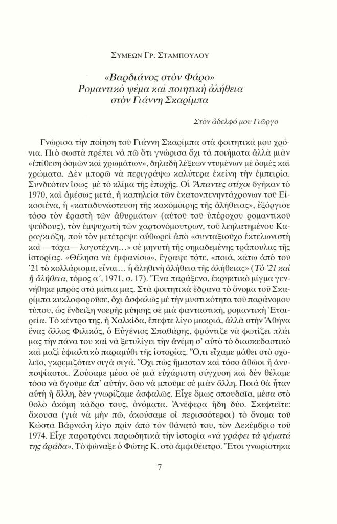 , «Βαρδιάνος στον Φάρο. Ρομαντικό ψέμα και ποιητική αλήθεια στον Γιάννη Σκαρίμπα», Τα Νεφούρια, τχ. 29 (Ιανουάριος 2012), σ. 7-11