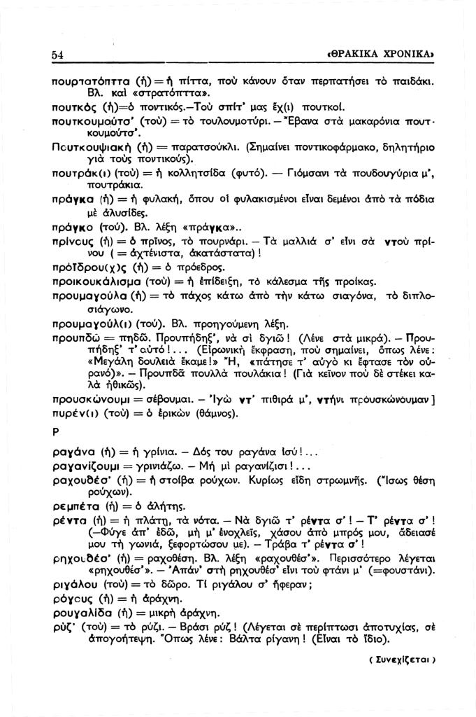 , «Λαογραφικά και γλωσσικά στοιχεία της παλήας Ξάνθης. Μέρος δεύτερο. Γλωσσάριο. Π», Θρακικά Χρονικά, τόμ. 4, τχ. 13 (Ιανουάριος 1964), σ. 53-54