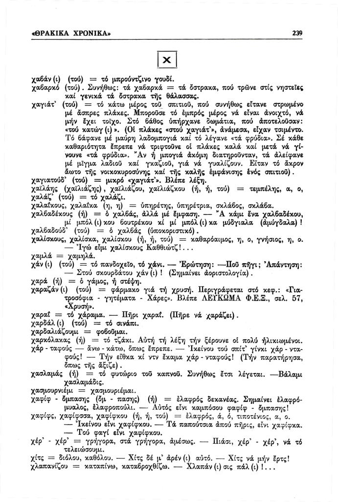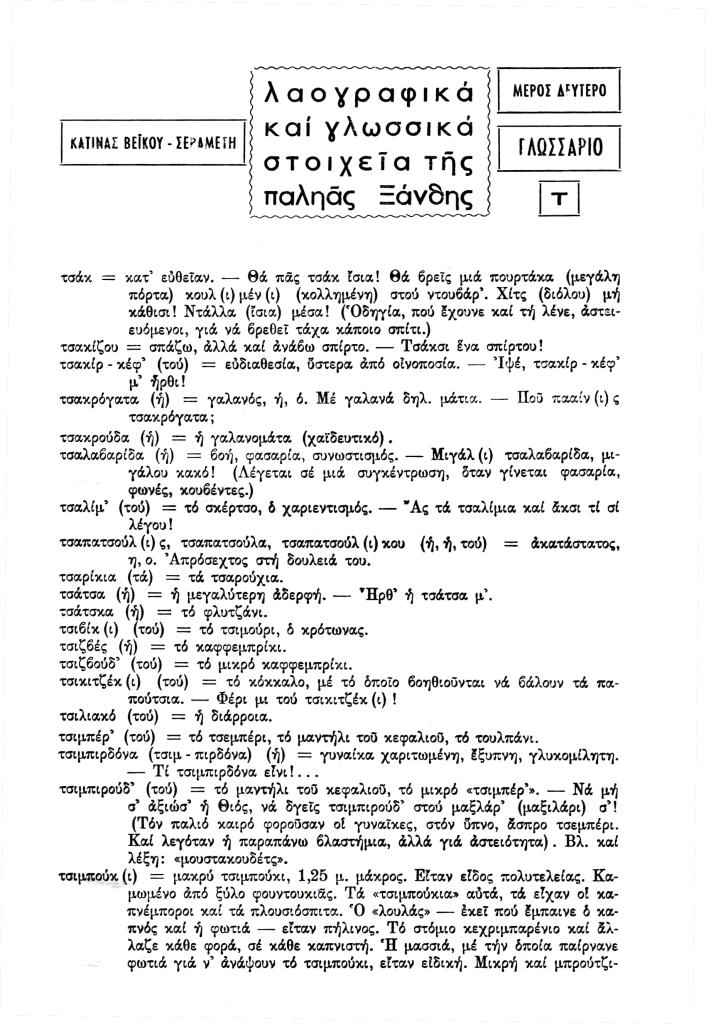 , «Λαογραφικά και γλωσσικά στοιχεία της παληάς Ξάνθης. Μέρος Δεύτερο. Γλωσσάριο. Τ-Ω», Θρακικά Χρονικά, τόμ. 5, τχ. 20 (Οκτώβριος 1965), σ. 237-240
