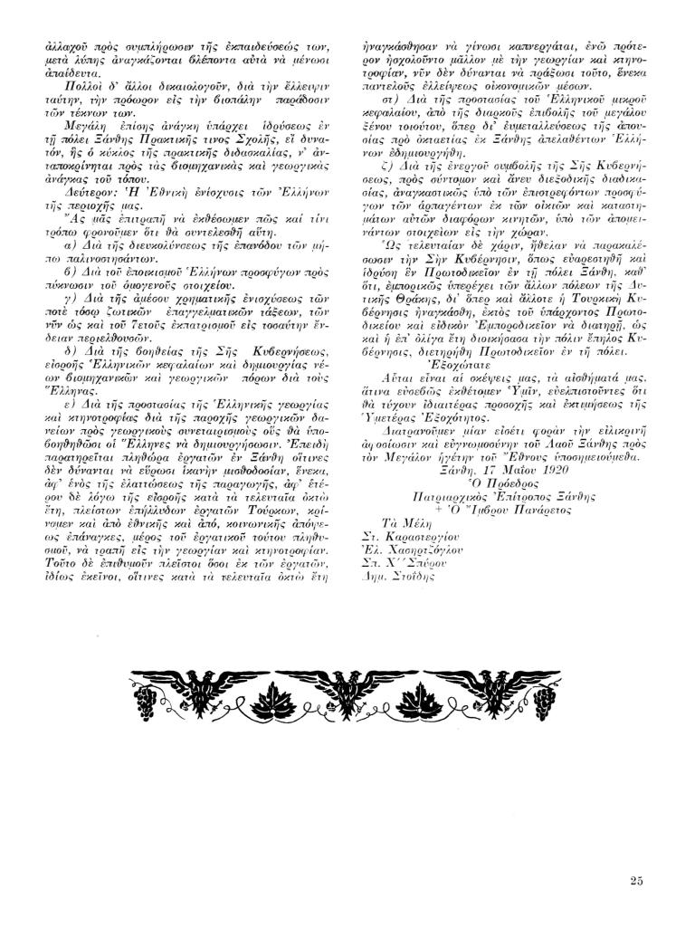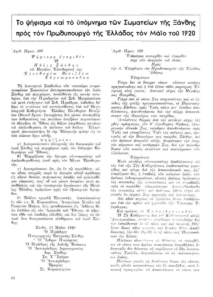 , «Α. Στοιχεία από την εκπαιδευτική ιστορία της Ξάνθης. Αφιέρωμα στο Δημοκρίτειο Πανεπιστήμιο Θράκης. Το ψήφισμα και το υπόμνημα των Σωματείων της Ξάνθης προς τον Πρωθυπουργό της Ελλάδος τον Μάιο του 1920», Θρακικά Χρονικά, τχ. 31 ( 1974), σ. 24-25
